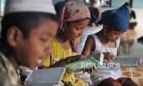 Sejumlah anak muslim Rohingya membaca alquran di masjid kampung Char Pauk, Sittwe, Myanmar, Sabtu (2/6). (FOTO : Republika/Edwin Dwi Putranto)