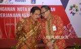 Menteri Agraria dan Tata Ruang/Kepala Badan Pertanahan Nasional Sofyan A Djalil (kiri) berbincang bersama Direktur Utama Bank Mandiri Kartika Wirjoatmodjo usai penandatanganan kerja sama di Jakarta, Senin (4/6). (FOTO : Republika/Prayogi)