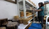 Seorang pedagang menanta kue kering yang akan dijual di Industri kue rumahan Palmy Kwitang, Jakarta Pusat, Senin (4/6). (FOTO : Republika/Mahmud Muhyidin)