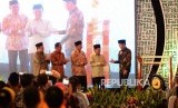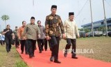 Peletakan Batu Pertama. Presiden Joko Widodo (tengah) bersama Wakil Presiden Jusuf Kalla (kanan) menuju tempat peletakkan batu pertama pembangunan Universitas Islam Internasional Indonesia (UIII) di Depok, Jawa Barat, Selasa (5/6). (FOTO : Republika/ Wihdan)