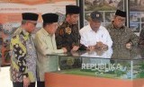Peletakan Batu Pertama. Presiden Joko Widodo (tengah) bersama Wakil Presiden Jusuf Kalla (kedua kiri), Menteri PUPR Basuki Hadimuljono (kedua kanan), Gubernur Jawa barat Ahmad Heryawan (kanan), dan Walikota Depok Mohammad Idris melihat maket pembangunan Universitas Islam Internasional Indonesia (UIII) di Depok, Jawa Barat, Selasa (5/6). (FOTO : Republika/ Wihdan)