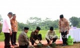 Peletakan Batu Pertama. Presiden Joko Widodo (tengah) bersama Wakil Presiden Jusuf Kalla (kedua kanan), Gubernur Jawa barat Ahmad Heryawan (ketiga kiri) sera jajaran menteri meletakkan batu pertama pembangunan Universitas Islam Internasional Indonesia (UIII) di Depok, Jawa Barat, Selasa (5/6). (FOTO : Republika/ Wihdan)