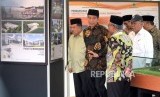 Peletakan Batu Pertama. Presiden Joko Widodo (tengah) bersama Wakil Presiden Jusuf Kalla (kiri), Menteri PUPR Basuki Hadimuljono (kedua kanan) melihat masterplan pembangunan Universitas Islam Internasional Indonesia (UIII) di Depok, Jawa Barat, Selasa (5/6). (FOTO : Republika/ Wihdan)