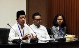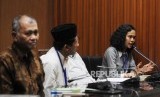 Ketua KPK Agus Rahardjo bersama Ketua PP Pemuda Muhamadiyah Virgo Sulistyo Gohardi dan Peneliti Indonesia Coruption Watch (ICW) Laola Ester (dari kiri) memberikan pernyataan saat konferensi pers di Gedung KPK, Jakarta, Selasa (5/6). (FOTO : Republika/Putra M. Akbar)