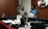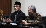 Mantan Ketua KPK M. Jasin bersama Ketua KPK Agus Rahardjo (dari kiri) memberikan pernyataan saat konferensi pers di Gedung KPK, Jakarta, Selasa (5/6). (FOTO : Republika/Putra M. Akbar)