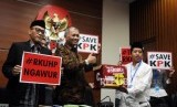 Mantan Ketua KPK M. Jasin bersama Ketua KPK Agus Rahardjo, Ketua PP Pemuda Muhamadiyah Virgo Sulistyo Gohardi (dari kiri) memberikan petisi dukungan secara simbolis usai konferensi pers di Gedung KPK, Jakarta, Selasa (5/6). (FOTO : Republika/Putra M. Akbar)