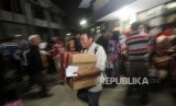 Para agen dan loper membawa bingkisan seusai acara buka puasa bersama agen dan loper koran Harian Republika di SMKN 57, Jakarta, Selasa (5/6). (FOTO : Republika/Mahmud Muhyidin)