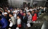 Para agen dan loper mengantre bingkisan seusai acara buka puasa bersama agen dan loper koran Harian Republika di SMKN 57, Jakarta, Selasa (5/6). (FOTO : Republika/Mahmud Muhyidin)