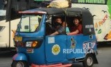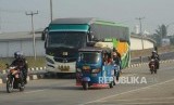 REPUBLIKA.CO.ID, KARAWANG -- Pemudik menggunakan bajaj melintasi kawasan jalur mudik jalan layang Lamaran, Karawang, Jawa Barat, Ahad (10/6). Dengan alasan menghemat biaya transportasi, sejumlah pemudik pulang ke kampung halaman mereka menggunakan kendaraan bajaj.