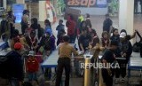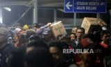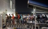 Pemudik yang akan menyebrang ke pulau Sumatera mengantri menaiki kapal di Pelabuhan Merak, Banten, Selasa (12/6). (FOTO : Republika/Prayogi)