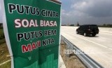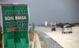 REPUBLIKA.CO.ID, Kendaraan melintas di samping spanduk pesan Jangan Ngebut-ngebut Ingat Anda Belum Nikah di Ruas Jalan Tol Pejagan-Pemalang, Tegal, Jawa Tengah, Selasa (12/6).