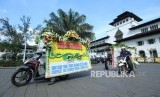 Dua dua pengantar karangan bunga bertulisakan ucapan terima kasih kepada Gubernur Jawa Barat Ahmad Heryawan (Aher) diakhir masa jabatannya terus berdatangan di Gedung Sate, Kota Bandung, Selasa (12/6). (FOTO : Republika/Edi Yusuf)