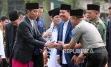 Presiden Joko Widodo bersalaman dengan Kapolda Jawa Barat Agung Budi Maryoto saat akan melaksanakan Shalat Idul Fitri 1439 Hijriah di Lapangan Astrid Kebun Raya Bogor, Kota Bogor, Jawa Barat, Jumat (15/6). (FOTO : Republika/Putra M. Akbar)