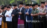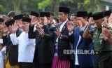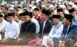 Presiden Joko Widodo (tengah) bersama Menteri Agama Lukman Hakim Saifuddin (ketiga kiri), Menteri Sekretariat Negara Pratikno (kedua kiri) dan Menteri Sosial Idrus Marham (kiri) saat melaksanakan Shalat Idul Fitri 1439 Hijriah di Lapangan Astrid Kebun Raya Bogor, Kota Bogor, Jawa Barat, Jumat (15/6). (FOTO : Republika/Putra M. Akbar)