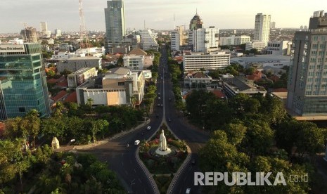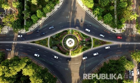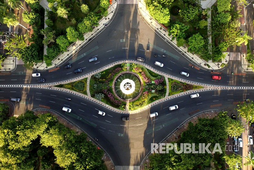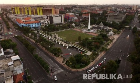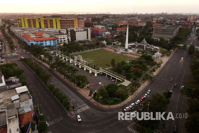 REPUBLIKA.CO.ID, SURABAYA -- Sejumlah kendaraan melintas di Kawasan Tugu Pahlawan, Surabaya, Jawa Timur, Senin (18/6).