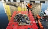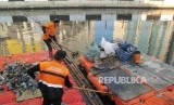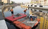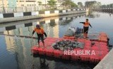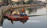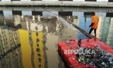 REPUBLIKA.CO.ID, JAKARTA -- Petugas UPK Badan Air Dinas Kebersihan Provinsi DKI Jakarta, sedang mengangkat sampah-sampah di daerah aliran kali Sentiong Jakarta, Selasa (19/6).