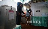 REPUBLIKA.CO.ID, SUKABUMI -- Pemilih tuna netra dibimbing oleh petugas tempat pemungutan suara (TPS) 20 ramah akses disabiltas saat memasukan kertas surat suara untuk pemilihan kepala daerah Kota Sukabumi dan Jawa Barat di Kota Sukabumi, Jawa Barat, Rabu (27/6).