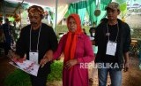 Pemilih lansia dibimbing oleh petugas tempat pemungutan suara(TPS) 20 ramah akses disabiltas usai melakukan pemilihan kepala daerah Kota Sukabumi dan Jawa Barat di Kota Sukabumi, Jawa Barat, Rabu (27/6). (FOTO : Republika/Iman Firmansyah)
