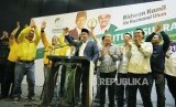 Calon Gubernur Jawa Barat Ridwan Kamil (Emil) bersama tim pendukung mengekspresikan kegembiraan, di Hotel Papandayan, Kota Bandung, Rabu (27/6). (FOTO : Republika/Edi Yusuf)