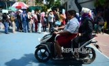 PPDB Kota Bandung. Seorang siswa berseragam sekolah dasar mengendarai sepeda motor melintasi antrean Perimaan Peserta Didik Baru (PPDB) di SMPN 34 Bandung, Senin (2/7). (FOTO : Yogi Ardhi/Republika)