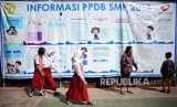 PPDB Kota Bandung. Siswa berseragam sekolah dasar melintasi baliho informasi Perimaan Peserta Didik Baru (PPDB) di SMPN 34 Bandung, Senin (2/7). (FOTO : Yogi Ardhi/Republika)