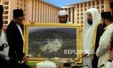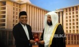 Wakil Ketua Umum Dewan Masjid Indonesia (DMI) Komjen Pol Syafruddin (kiri) bersama Imam Masjidil Haram Syekh Hasan Abdul Hamid Bukhari (kanan) memberikan cinderamata saat pertemuan di Kantor DMI, Kebayoran Baru, Jakarta, Rabu (4/7). (FOTO : Republika/Putra M. Akbar)