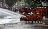 Petugas pemadam kebakaran mengguyurkan air ke wajahnya saat berusaha memadamkan api yang melalap gudang di Jalan Kampung Bandan, Pademangan, Jakarta, Kamis (5/7). (FOTO : Republika/Mahmud Muhyidin)