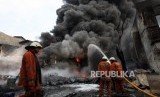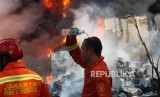 Petugas pemadam kebakaran berusaha memadamkan api yang melalap gudang di Jalan Kampung Bandan, Pademangan, Jakarta, Kamis (5/7). (FOTO : Republika/Mahmud Muhyidin)