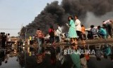 Sejumlah warga melintas disamping kebakaran gudang di Jalan Kampung Bandan, Pademangan, Jakarta, Kamis (5/7). (FOTO : Republika/Mahmud Muhyidin)