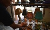 Perajin Wayang Golek Tatang Haryana bersama salah satu jenis karyanya berupa lampu wayang, di Ruhiyat Wooden Puppet & Mask, Jalan Pangarang Bawah, Kota Bandung, Kamis (5/7). (FOTO : Irfan Risyadien)