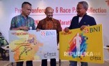Vice President Divisi Hubungan Kelembagaan BNI Ahmad Salman, Wasekjen ILUNI UI Nongki Wisaksono Soeghandi, bersama Ketua Pelaksana BNI-UI Half Marathon 2018 Irfan Ferdiansyah (kiri-kanan) memperlihatkan desain khusus TapCash BNI yang dibuat untuk kegiatan BNI - UI Half Marathon yang diperlihatkan kepada media saat jumpa pers di Jakarta, Rabu (11/7). (FOTO : Darmawan/Republika)