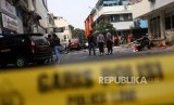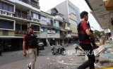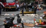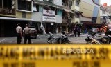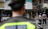 Petugas kepolisian memeriksa Tempat Kejadian Perkara (TKP) ledakan gas di Ruko Perkantoran Grand Wijaya Center, Kebayoran Baru, Jakarta, Kamis (12/7). (FOTO : Republika/Mahmud Muhyidin)