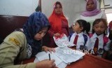 Warga mendaftarkan anaknya pada hari pertama sekolah di SDN Mutiara, Desa Cibeber II, Leuwiliang, Kabupaten Bogor, Jawa Barat, Senin (16/7). (FOTO : Republika/Putra M. Akbar)