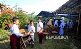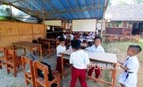 Sejumlah pelajar membawa meja untuk digunakan belajar di kelas tenda darurat pada hari pertama sekolah di SDN Mutiara, Desa Cibeber II, Leuwiliang, Kabupaten Bogor, Jawa Barat, Senin (16/7). (FOTO : Republika/Putra M. Akbar)