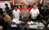 Kapolres Metro Jakarta Selatan Kombes Pol Indra Jafar memberikan keterangan kepada media saat rilis pengungkapan kasus pelaku begal di Mapolres Jakarta Selatan, Jakarta, Selasa (17/7). (FOTO : Republika/Mahmud Muhyidin)