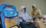 Pegawai PT Bank Syariah Mandiri (Mandiri Syariah) tengah melayani jamaah haji Indonesia yang sedang menukar Saudi Arabian Riyal (SAR) di Embarkasi Haji Pondok Gede Jakarta, Selasa (17/7). (FOTO : Republika/Edwin Dwi Putranto)