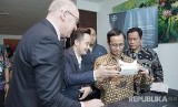 Direktur Jenderal Pencegahan dan Pengendalian Penyakit Kementrian Kesehatan dr. Anung Sugihantono (ketiga dari dikiri) di dampingi Jason Nash (kiri) dan Yudi Clements (kedua dari kiri) mengoperasikan perangkat cardboard Bayer Mosquito Quest di Jakarta, Seals (17/7). Alat ini adalah asesoris digital yang bertujuan untuk tingkatkan edukasi mengenai Demam Berdarah Dengue kepada anak-anak dengan cara yang interaktif dan menyenangkan. (FOTO : Dok Bayer)