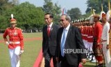 Kunjungan Kenegaraan Presiden Mikronesia. Presiden Joko Widodo (kiri) bersama Presiden Federasi Serikat Mikronesia H.E. Peter M. Christian memeriksa pasukan saat kunjungan kenegaraan di Istana Kepresidenan Bogor, Jawa Barat, Rabu (18/7). (FOTO : Republika/ Wihdan)