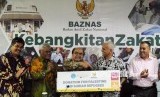 Ketua Baznas Bambang Sudibyo (tengah) memberikan bantuan secara simbolis kepada Sekretaris Jenderal The Jordan Hashemite Charity Organization for Relief & Development (JHCO) Ayman R. Al-Mufleh (kedua kanan) didampingi Wakil Ketua Baznas Zainulbahar Noor (kedua kiri) usai melakukan pertemuan kerja sama di kantor Baznas, Jakarta, Rabu (18/7). (FOTO : Republika/Putra M. Akbar)