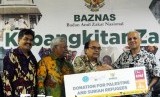 Ketua Baznas Bambang Sudibyo (kedua kanan) memberikan bantuan secara simbolis kepada Sekretaris Jenderal The Jordan Hashemite Charity Organization for Relief & Development (JHCO) Ayman R. Al-Mufleh (kanan) didampingi Wakil Ketua Baznas Zainulbahar Noor (kedua kiri) usai melakukan pertemuan kerja sama di kantor Baznas, Jakarta, Rabu (18/7). (FOTO : Republika/Putra M. Akbar)