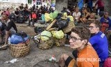 Sejumlah wisatawan pendaki Gunung Rinjani berhasil turun saat terjadi gempa di pintu pendakian Bawaq Nau, Kecamatan Sembalun, Selong, Lombok Timur, NTB, Minggu (29/7). (FOTO : Ahmad Subaidi/Antara)
