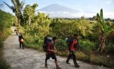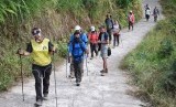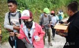 Pendaki Gunung Rinjani yang sempat terjebak longsor akibat gempa bumi tiba di Pos Bawaknao, Sembalun, Lombok Timur, NTB, Senin (30/7). (FOTO : Antara/Akbar Nugroho Gumay)