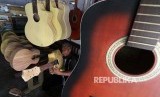 Perajin gitar akustik Kusnan (57) melakukan pengecekan presisi gitar buatannya di rumah sekaligus bengkel kerja di Kelurahan Banjaran, Kota Kediri, Jawa Timur, Senin (30/7). Gitar berbahan baku 90 persen bambu tersebut dipasarkan secara daring dengan harga Rp400.000-Rp3.500.000 per unit. (FOTO : Prasetia Fauzani/Antara)