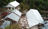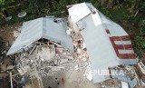 Foto aerial kerusakan bangunan akibat gempa bumi di Desa Sajang, Lombok Timur, NTB, Senin (30/7). Gempa bumi berkekuatan 6,4 pada skala richter Minggu (29/7) kemarin telah mengakibatkan korban 15 orang meninggal dunia, 162 orang luka-luka serta ratusan rumah rusak. (FOTO : Akbar Nugroho Gumay/Antara)