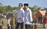 Presiden Joko Widodo (kiri) didampingi Gubernur NTB TGB Zainul Majdi (kanan) mengunjungi pengungsian korban gempa bumi di Desa Madayin, Kecamatan Sambelia, Selong, Lombok Timur, NTB, Senin (30/7). Presiden Jokowi mengatakan pemerintah akan memberikan bantuan untuk perbaikan Rp 50 juta per rumah korban gempa yang mengalami kerusakan. (FOTO : Ahmad Subaidi/Antara)