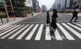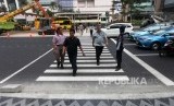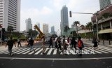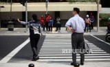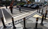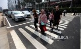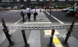REPUBLIKA.CO.ID, JAKARTA -- Pejalan kaki melintas di Pelican Crossing untuk menyebrang di Bundaran HI, Jakarta, Selasa (31/7).