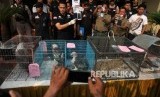 REPUBLIKA.CO.ID, JAKARTA -- Sejumlah satwa liar diperlihatkan saat rilis pengungkapan jaringan perdagangan satwa liar antar daerah secara daring di Polres Jakarta Barat, Jakarta, Selasa (31/7).