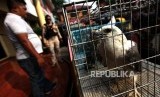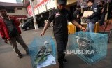 Petugas membawa barang bukti dua ekor burung elang saat rilis pengungkapan jaringan perdagangan satwa liar antar daerah secara daring di polres Jakarta Barat, Jakarta, Selasa (31/7). (FOTO : Republika/Mahmud Muhyidin)