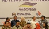 Sindikasi Pembiayaan Tol Cikampek. Direktur Keuangan PT Jasa Marga Donny Arsal (berdiri kiri), Direktur Corporate Banking Bank Mandiri RoykeTumilaar (berdiri kedua kiri), berbincang dengan Direktur Utama PT Jasa Marga (berdiri ketiga kiri) saat menyaksikan penandatanganan kredit sindikasi pembangunan Tol Cikampek II di Jakarta, Selasa (31/7). (FOTO : Republika/ Wihdan)