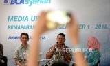 Kenaikan Laba Semester Pertama. Direktur Utama BCA Syariah John Kosasih (kedua kanan) memberikan paparan kinerja BCA Syariah Semester pertama di Jakarta, Selasa (31/7). (FOTO : Republika/ Wihdan)
